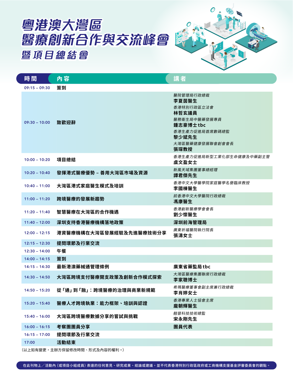 暫定內容 :• 發揮港式醫療優勢 - 善用大灣區市場及資源• 大灣區醫療政策最新解讀與港澳藥械通進展• 從「通」到「融」:跨境醫療的治理與商業新規範• 港資醫療機構在大灣區落地實戰分享• 智慧醫療在大灣區的合作機遇• 醫療人才跨境執業:能力框架、培訓與認證